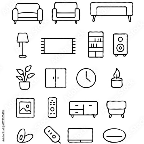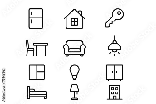 3d Collection of furniture and appliances depicted as simple line drawings, representing common household items in a minimalist style.
