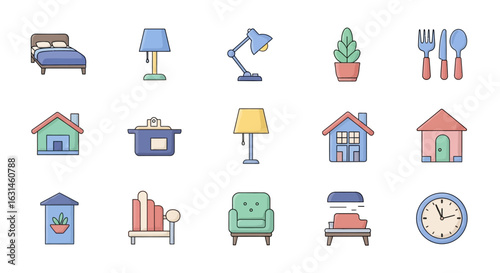 A collection of fifteen pastel-colored, outlined icons representing common household objects and furniture, arranged in three rows on a white background.