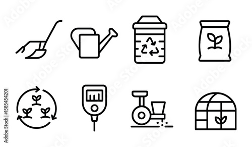Sustainable Farming Icons. Outline icon set of Sustainable farming tools: plow, watering can, compost bin,