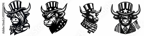 Highland Cow. 4th of July Independence Day American Flag Patriotism Usa America Clipart Vector Illustration. Scottish cattle breed rustic bovine hairy coo from the highlands agriculture.