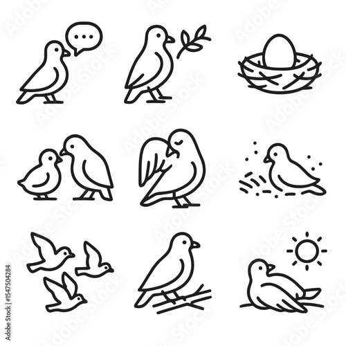 Dove Behavior Icons. Outline icon set of dove behaviors: cooing speech bubble, nest building twig, egg in nest, feeding chick,