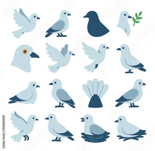 Dove Anatomy and Poses modern flat style. flying dove, perched dove, dove silhouette, dove with olive branch, dove head close-up, wings spread, dove in flight, cooing