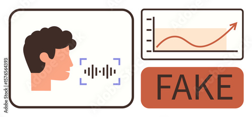 Side profile of a face with soundwave, upward graph, and Fake alert. Ideal for technology, AI, security, deception, data analysis fraud detection ethical AI. Simple flat metaphor