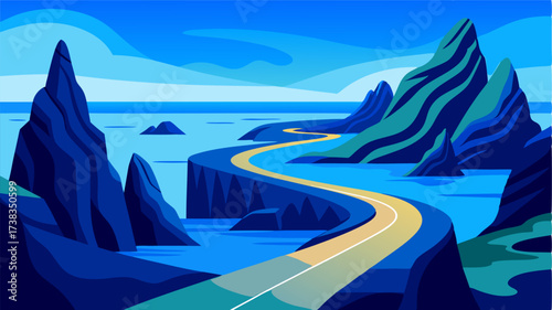 A winding road leading to a secluded beach framed by dramatic rock formations and framed by the sapphire blue sea.