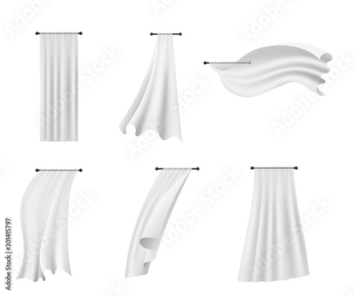 Curtains for window, doorway, theater stage. Set of vector icons in outline style isolated on white. Various curtain options for narrow and wide windows.