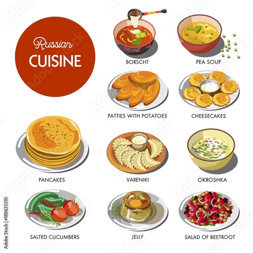 Russian cuisine menu with traditional food dishes and meals, vector restaurant lunch poster. Russian cuisine borscht beet soup and beef stroganoff, blini pancakes and meat dumplings pelmeni