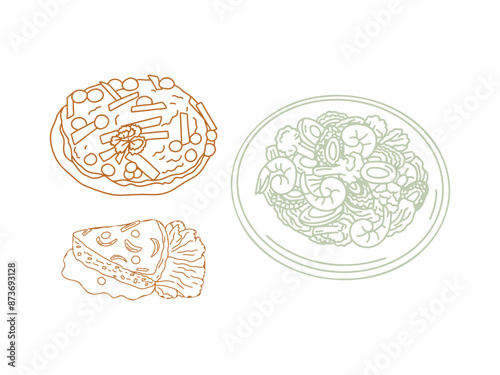 Pasta dish meal in a white bowl set. Side view. Italian delicious macaroni farfalle spaghetti meatballs noodles with egg dumpling bolognese. With pesto tomato sauce. Cartoon style isolated food vector