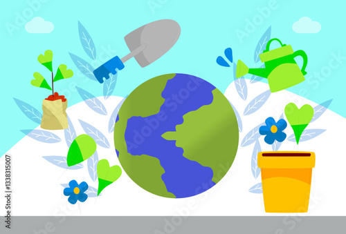 Green Earth plant symbol. Environmental conservation concept. Planet and leaves. Eco world cartoon. Global ecological action. Carbon neutrality. Sprout growth idea. Vector illustration, flat, clip ar