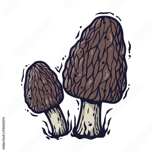 set of sketch mushrooms plant hand drawn. Hand drawn various edible mushroom morel, truffle, champignon, black and king trumpet, bolete mushroom. Organic vegetarian product label