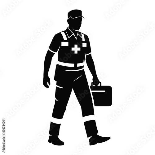 Paramedic silhouette. This image showcases a bold black silhouette of a paramedic, also referred to as an EMT or first responder, holding medical equipment. Vector clipart illustration design.