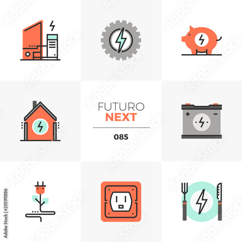 Icons in two colors about  energy efficiency and saving. Sustainable development.