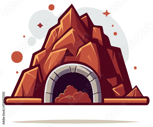 Stylized mine entrance illustration with a rocky mountain cave and excavated material inside