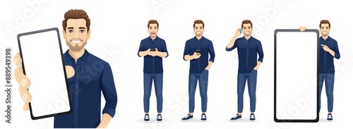 Portrait of happy young caucasian positive excited man and woman using mobile phone. Comic book style, cartoon vector illustration.
