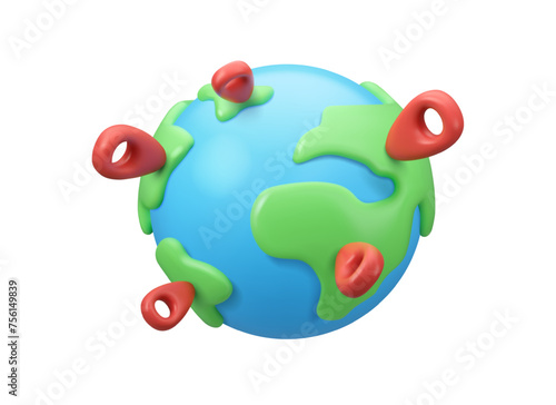 Vector 3d Earth with pins icon. Planet and location map labels. Business expansion or travel destinations concept, isolated on white background. Worldwide delivery illustration