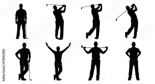 Golfer pose silhouette vector collection with swing, putt, drive, chip, bunker shot and caddie walk for sport design