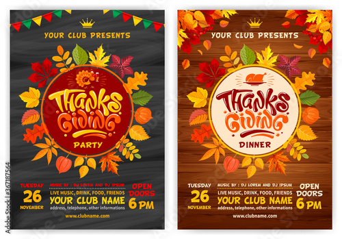 Set of vector templates for flyers or posters on Thanksgiving Day. Black chalkboard and wooden background with autumn leaves. Cheerful turkey, calligraphic inscription Thanksgiving and space for text.