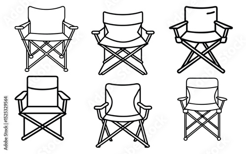 Portable folding chairs, collapsible camping tables, outdoor furniture silhouettes, black and white vector illustration, patio, picnic, travel, leisure, design, stock image