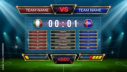 football scoreboard and global stats broadcast graphic soccer template, 2018 soccer information score, statistics, shots, offsides, corners, fouls committed and ball possession
