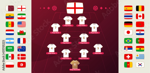 Set of national teams flag and line-up world Football 2022 tournament final stage vector illustration. Country team lineup table and Team Formation on Football Field. Vector country flags.