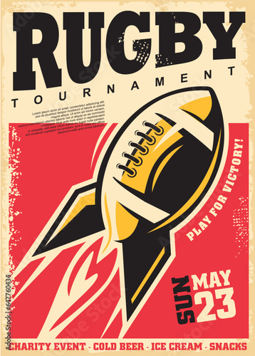 Old poster design for rugby tournament. Sports and recreation vector illustration with rugby or American football ball. Retro ad rocket ball with flames and motion trails.