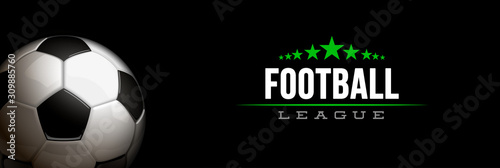 football tournament sport poster design banner with 3d realistic shiny ball isolated on black background. horizontal flyer Illustration soccer championship template with realistic black and white ball