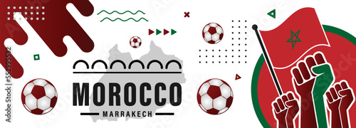 Morocco FIFA 2022 Football match banner with abstract modern design. Raised fists, Map and geometric background in Flag color theme.