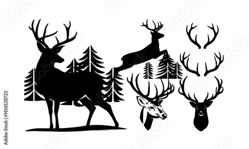 Set of black forest deer silhouettes. Suitable for logo, emblem