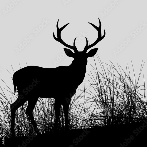 Monochrome vector illustration of a majestic deer head with large antlers.