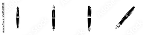 Fountain Pen Nib Black Silhouette Vector Set Writing Tool, Calligraphy, Stationery, Ink Marker, Author, and Traditional Artistic Drawing Graphic Collection