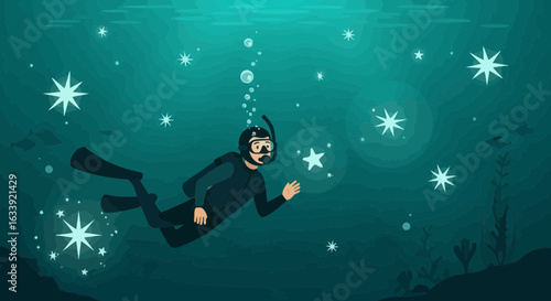 Underwater Adventure Diver Exploring A Magical Seascape With Shining Stars