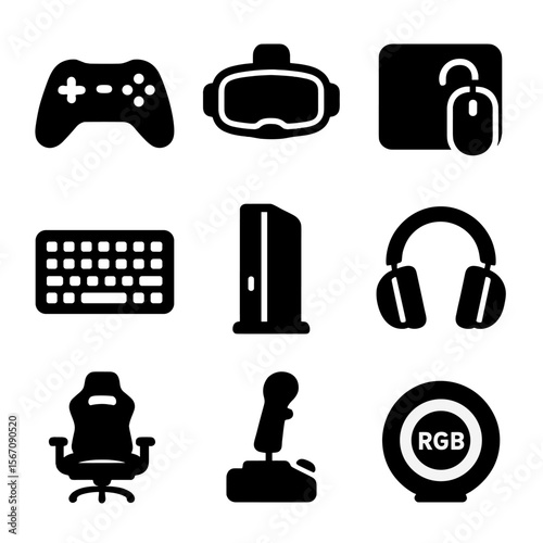 Gaming Gadgets Icons. Solid, filled icons set of gaming and tech gifts: game controller, VR headset, mousepad,