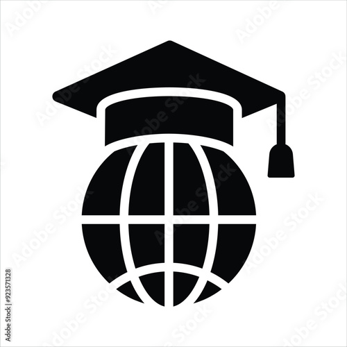 Minimalist line art illustration of a globe wearing a graduation mortarboard cap, symbolizing international education and global student success on a white background.