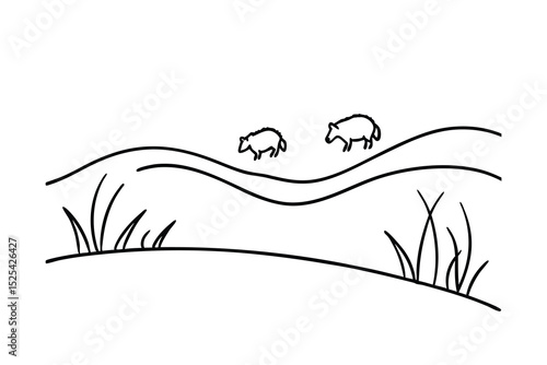 Grassland Dawn Doodles. Hand-drawn doodle illustration Grasslands at dawn sun rising, horizon line, tall grass, wildflowers, tree, bird in flight, butterfly,