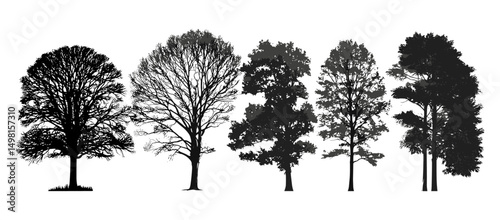 Dynamic botanical illustration set showcasing multiple healthy green trees in distinct artistic