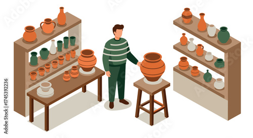 Isometric pottery workshop with artisan crafting ceramic vases on a wheel