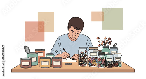 Illustration of a potter in an apron sitting at a pottery wheel, skillfully shaping a clay vase in a cozy workshop setting.
