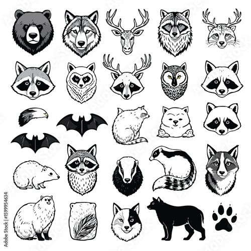 Collection of stylized woodland and nocturnal animal portraits and icons