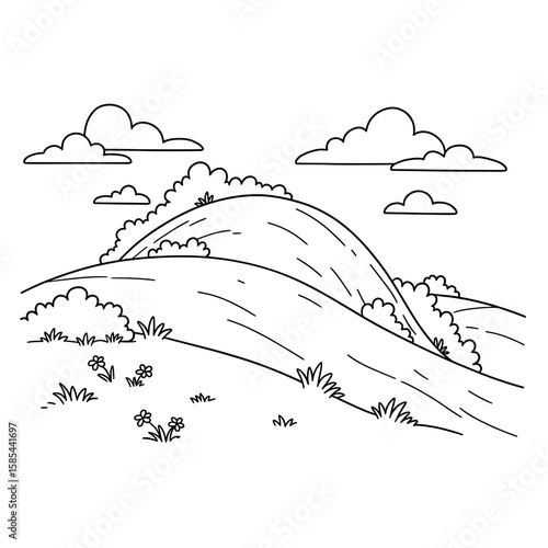 Cartoon hills with bushes and grass, under cloudy sky. Black outline style