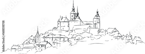 Black and white line drawing of a historic hilltop castle with surrounding village and steeples