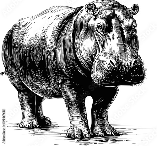 Hand-drawn hippo in water, vintage engraving, monochrome etching, African mammal illustration, black sketch style, wildlife art print, old-fashioned engraving, nature decor,