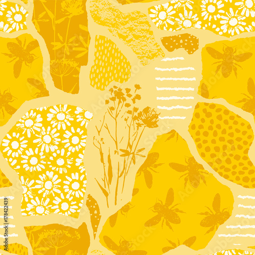 Bee honey pattern Bee seamless pattern Cute hand drawn summer meadow flowers, bee honeycombe background Hand drawn honey templates. Kids fabric design. Summer illustration. Floral sweet bee print.
