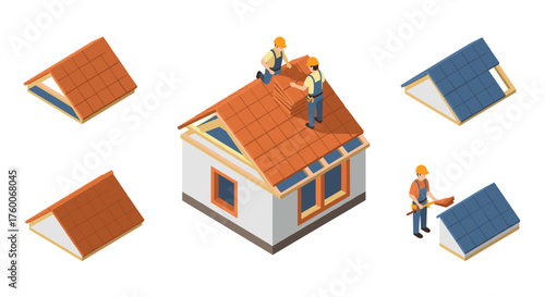 House construction silhouettes, home renovation, roof repair, workers painting and building, handyman service, residential maintenance, teamwork