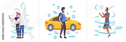 set people taking selfie photo ordering taxi wearing fitness tracker men women using different gadgets digital technology concepts collection flat hull length horizontal