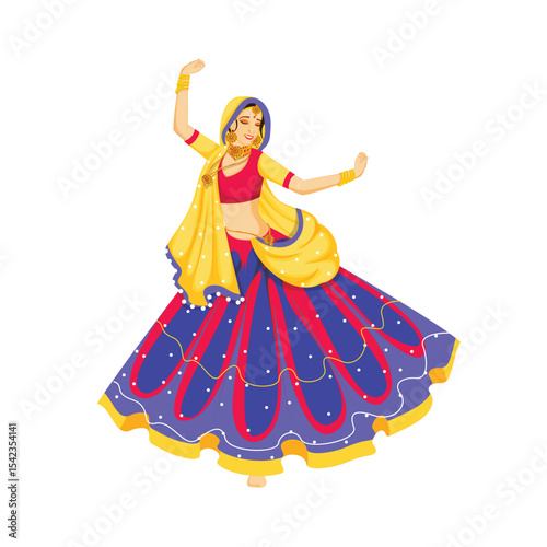 Silhouette of a dancing indian woman celebrating garba with colorful traditional dress