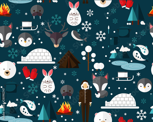 seamless pattern with Eskimos and arctic animals - vector illustration, eps