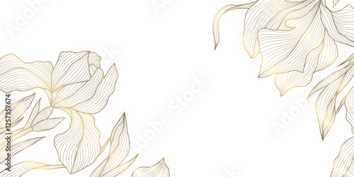 Vector golden iris flowers frame, vintage floral border, blossom background. Luxury line botanical, nature ornament