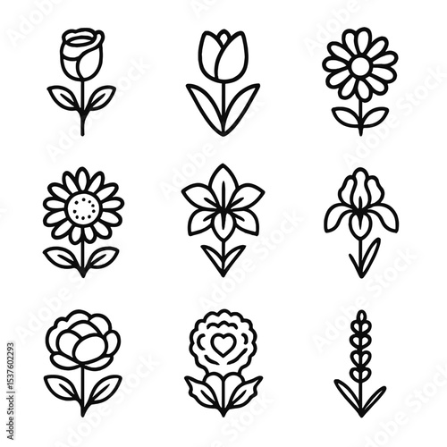 A collection of five different types of flowers drawn in a simple line art style, showcasing their unique petal structures and stems.