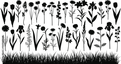 Variety of spring flowers silhouettes narcissus iris tulip daisy simple botanical design