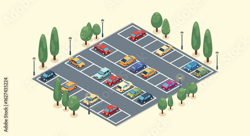 Isometric vector illustration of a city parking lot with colorful cars, trees, and street lamps.