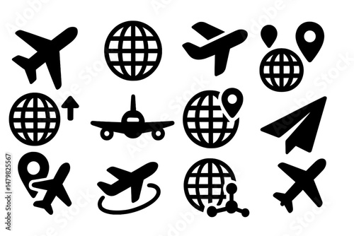 Set of travel icons, black and white vector illustration of airplanes, luggage, maps, and other travel symbols, isolated collection for tourism, trips, and vacation concepts